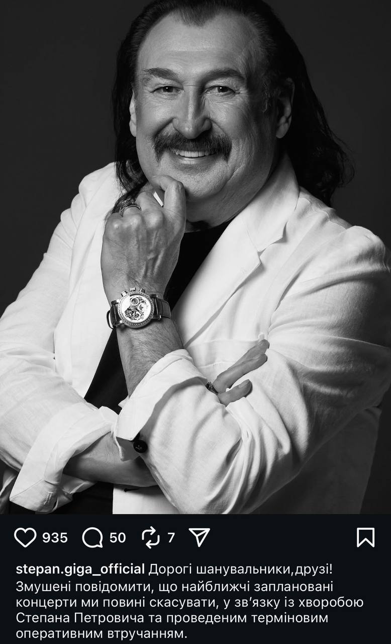 Команда музиканта повідомила, що через важку хворобу Степан Гіга переніс оперативне втручання. Усі заплановані концерти найближчим часом скасовано.