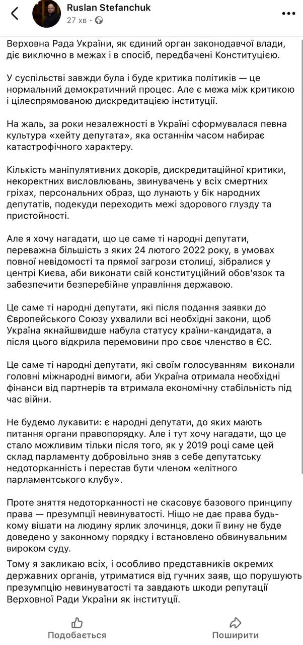 Стефанчук вступився за депутатів та закликав «утриматися від гучних заяв, що порушують презумпцію невинуватості», але чомусь закрив коментарі до цього допису