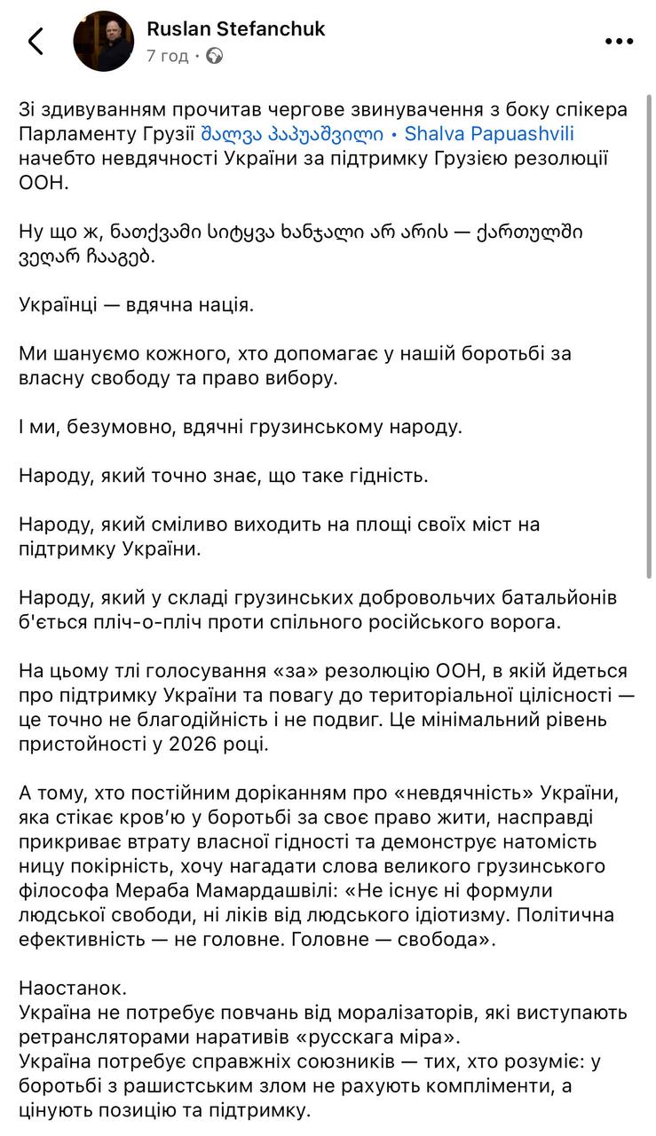 Україна не потребує повчань від моралізаторів, які виступають ретрансляторами наративів «русскага міра»: Стефанчук відповів спікеру парламенту Грузії, який дорікнув Україні за «невдячність»
