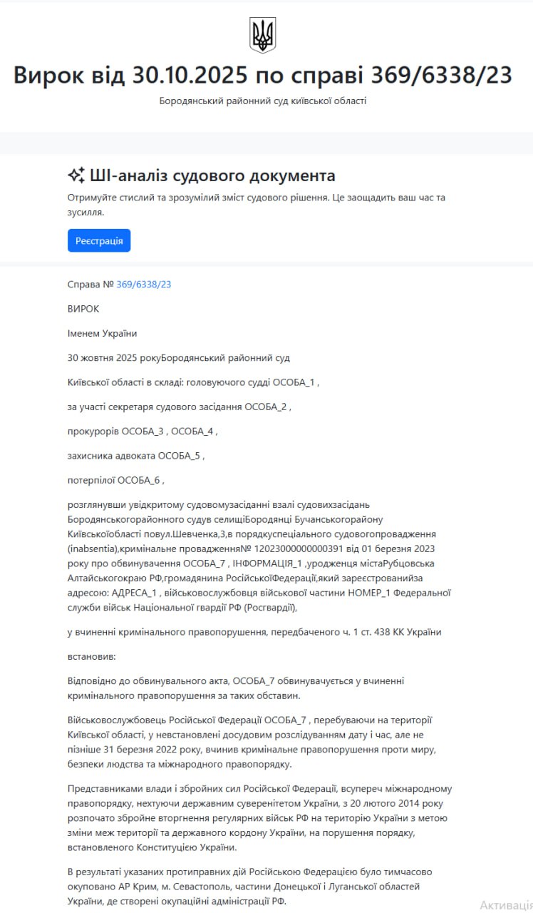 ️ Вперше в Україні суд виправдав російського окупанта у справі про мародерство на Київщині Бородянський районний суд Київської області 30 жовтня ухвалив виправдувальний вирок щодо росгвардійця Євгєнія Мурзінцева, обвинуваченого у пограбуванні приватного будинку в селі Блиставиця під час окупації Київщини у 2022 році. ️ За даними обвинувачення, Мурзінцев проник у будинок і викрав побутову техніку, відеокамеру, комп’ютерні комплектуючі та чоловічий одяг. Потерпіла жінка виїхала з села 26 лютого 2022 року, а після звільнення території виявила зникнення речей та сліди перебування окупантів. Суд визнав доведеним, що Мурзінцев перебував у складі військової частини 6720 Росгвардії на території Бучанського району, а після відступу до Білорусі відправив посилку з описом “речі” до Росії. Водночас суд дійшов висновку, що доказів його особистої участі у викраденні майна недостатньо.