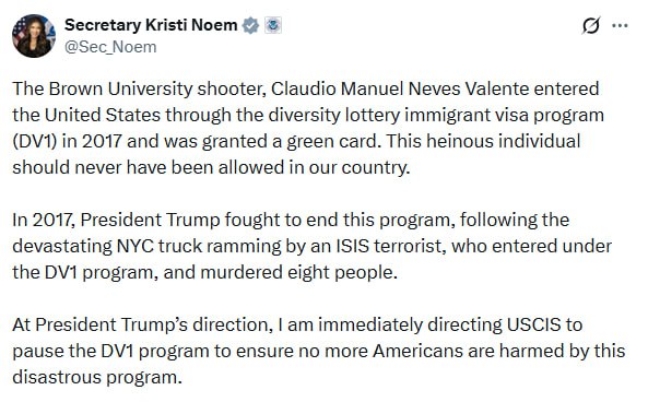 Міністерка внутрішньої безпеки США Крісті Ноем заявила про призупинення програми Diversity Visa Program (DV), відомої як розіграш «Грін карт». За її словами, рішення ухвалене після стрілянини в Університеті Брауна.