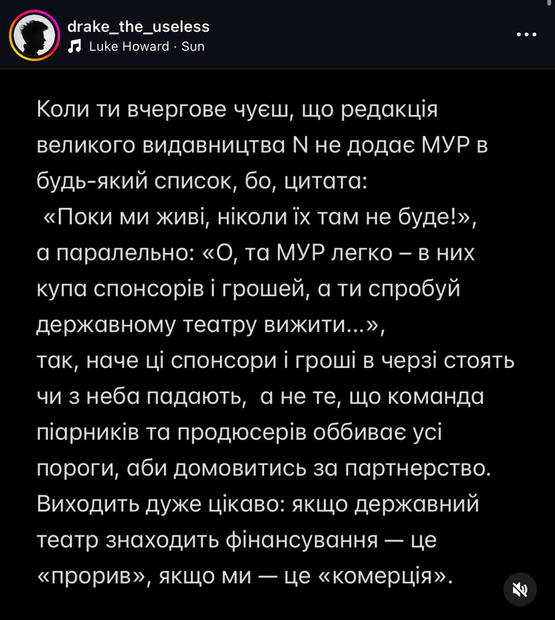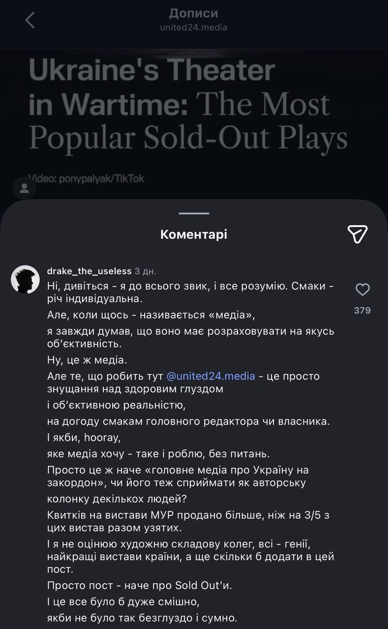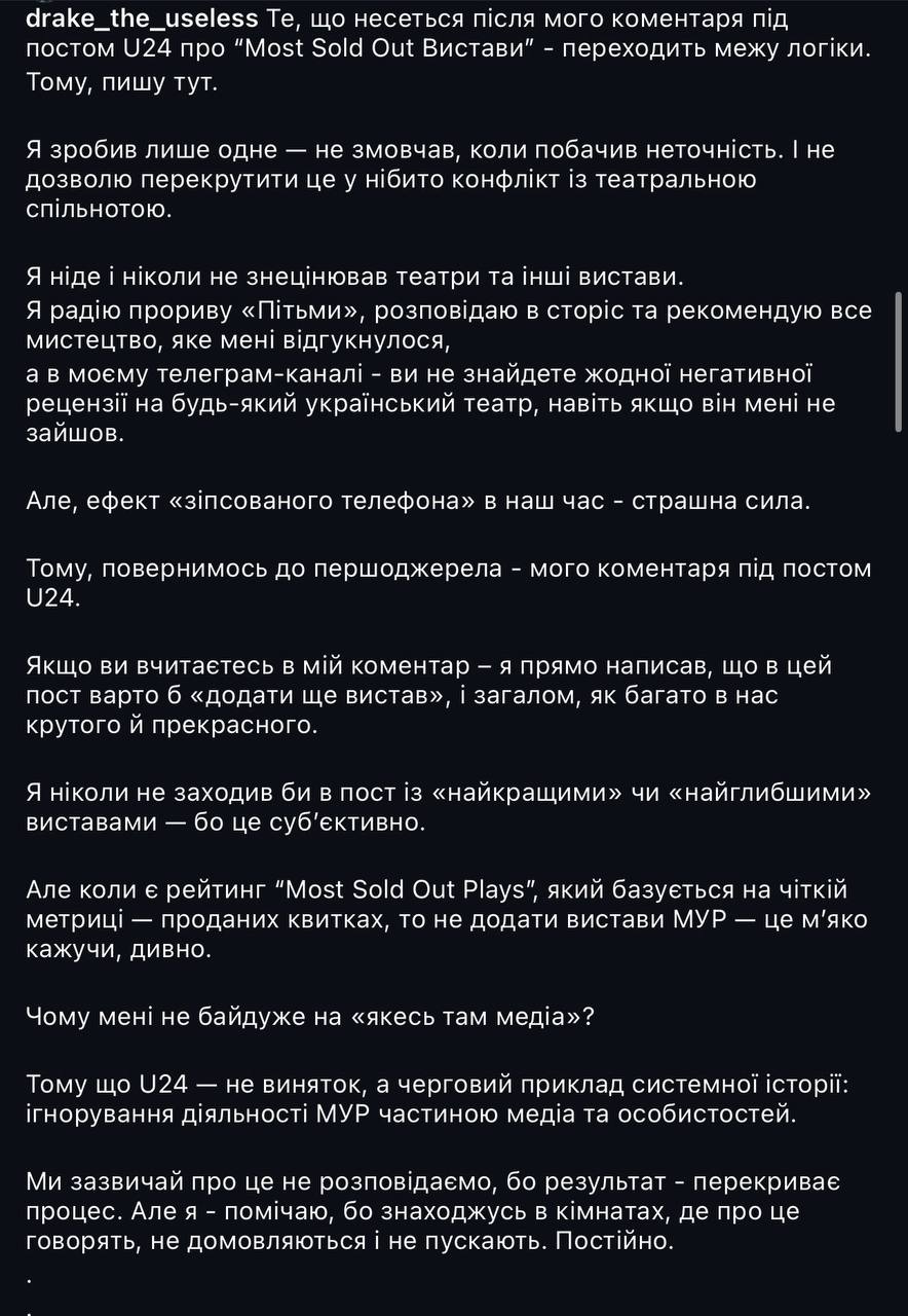 Тим часом мережею шириться театральний скандал, Олександр Хоменко з «МУР» вступив у перепалку з проєктом U24, через те, що вони не згадали роботу «МУР» у переліку вистав де постійно розкуплені всі квитки