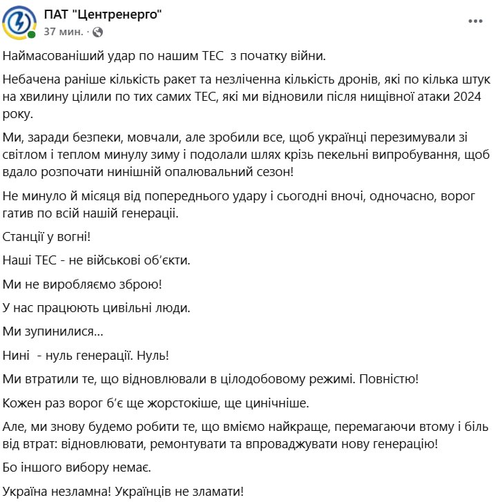 ️️Генерації – нуль: усі ТЕС «Центренерго» зупинилися після нічної атаки рф та більше не генерують електроенергію