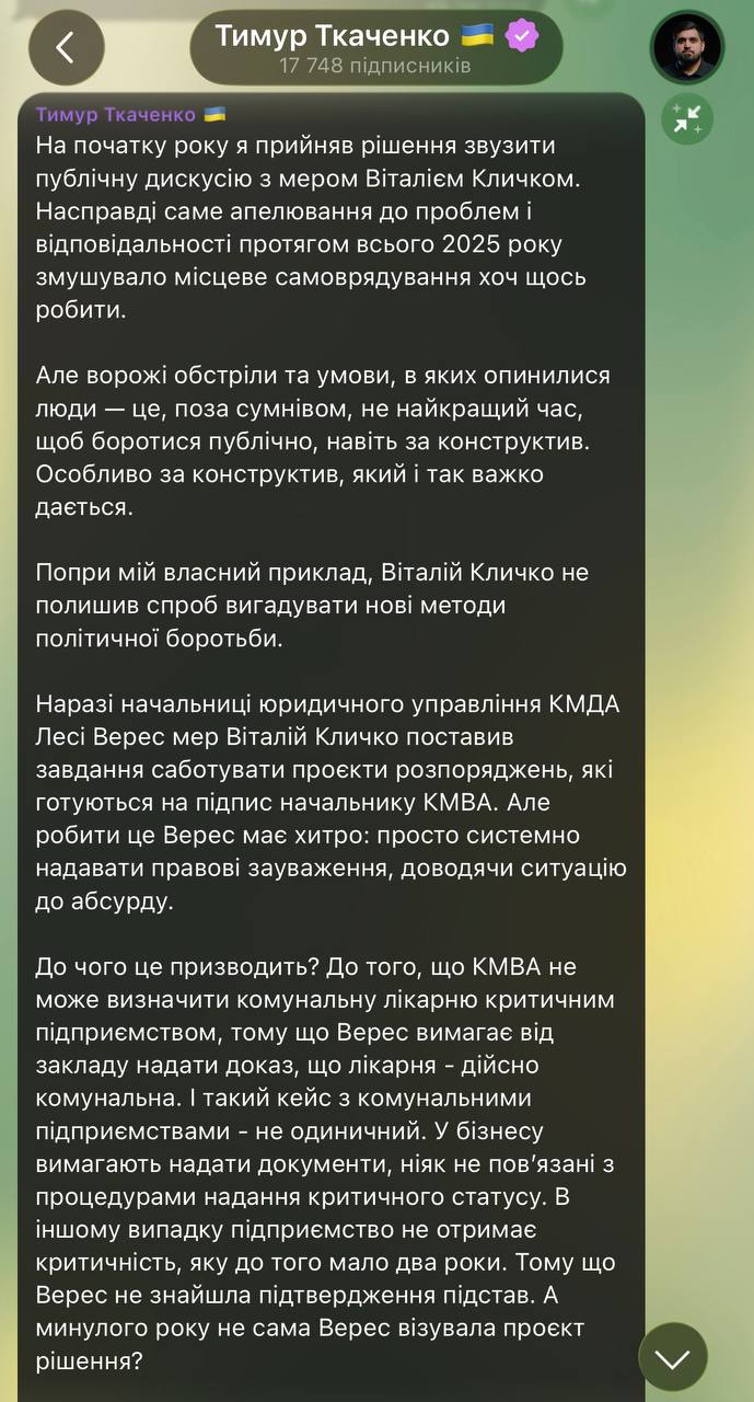 Наразі начальниці юридичного управління КМДА Лесі Верес мер Віталій Кличко поставив завдання саботувати проєкти розпоряджень, які готуються на підпис начальнику КМВА.