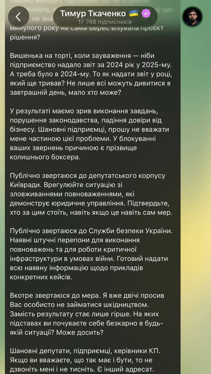 У самому ж дописі Тимур Ткаченко жаліється, що попри його приклад Кличко не припиняв «воювати».