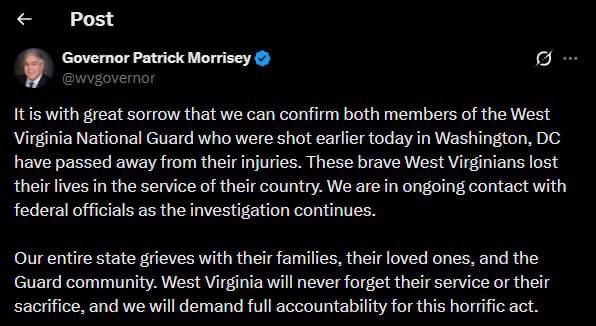 ️Стрілянина у Вашингтоні: обидва нацгвардійці померли від отриманих поранень, повідомив губернатор Західної Вірджинії.