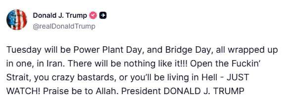 Вівторок буде Днем електростанції та Днем мосту – два в одному. Нічого подібного раніше не було! Відкрийте чортову протоку, скажені покидьки або ви будете жити в пеклі.