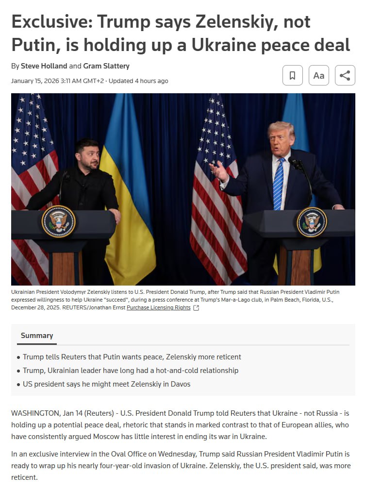 На запитання, чому переговори під проводом США не привели до завершення війни, Трамп відповів: “Зеленський”. Інтерв’ю відбулося 14 січня в Овальному кабінеті.