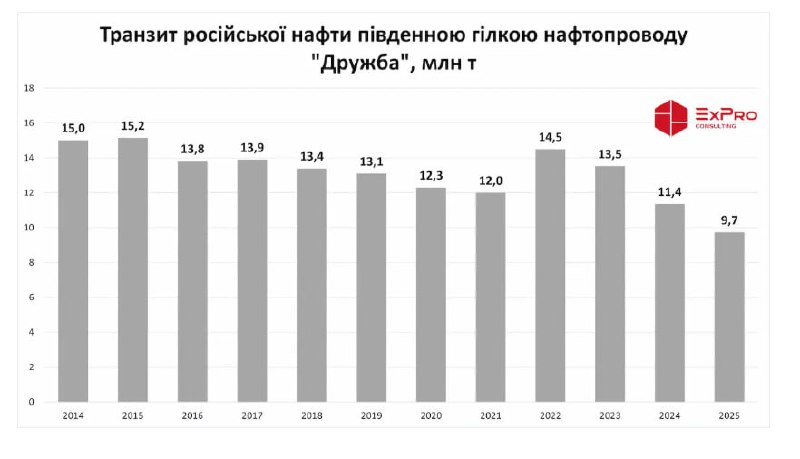 У 2025 році найбільшими покупцями російської нафти, що транспортувалась через Україну, залишались Словаччина — 4,9 млн т, що на 24% більше рік до року, та Угорщина — 4,35 млн т, що на 8% менше, ніж у 2024 році.