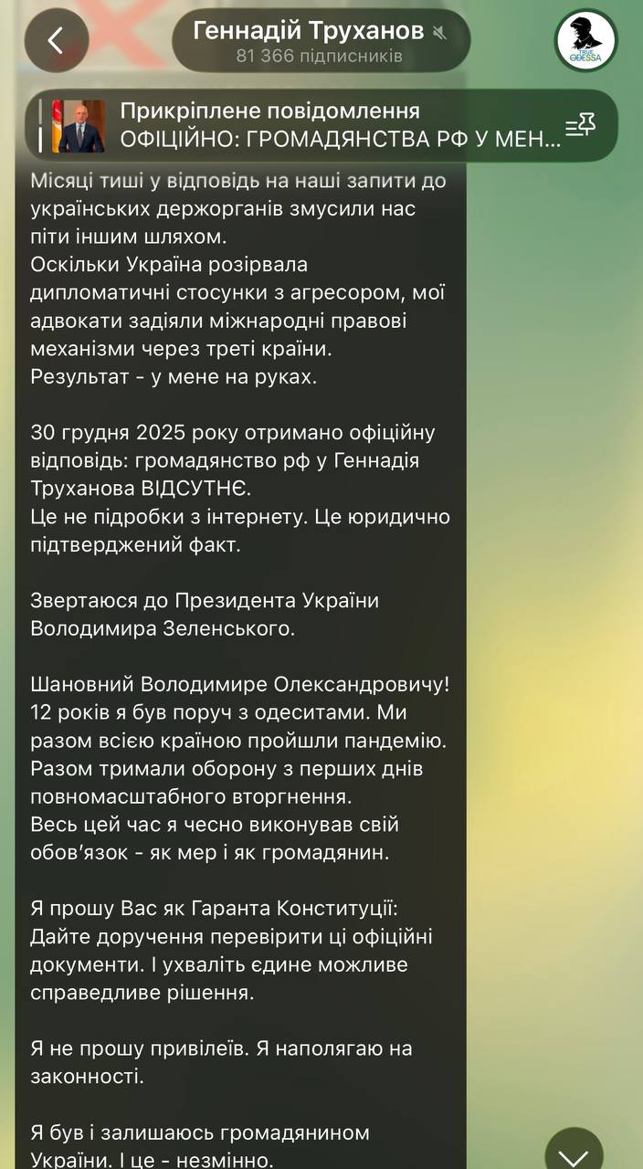 30 грудня 2025 року отримано офіційну відповідь: громадянство рф у Геннадія Труханова ВІДСУТНЄ.