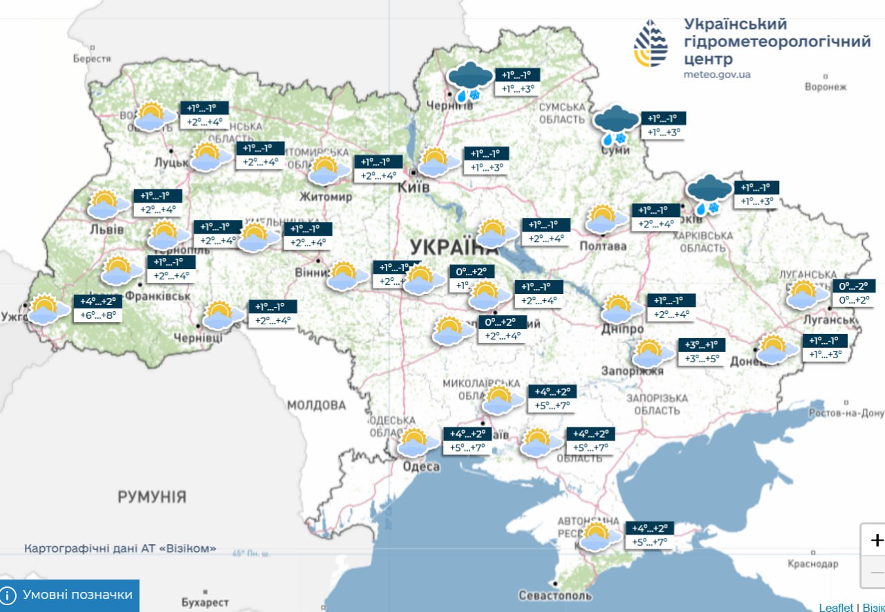 Температура по області вночі — від 2° тепла до 3° морозу️, вдень — 0–5° тепла️. У Києві вночі — близько 0°️, вдень — 1–3° тепла .