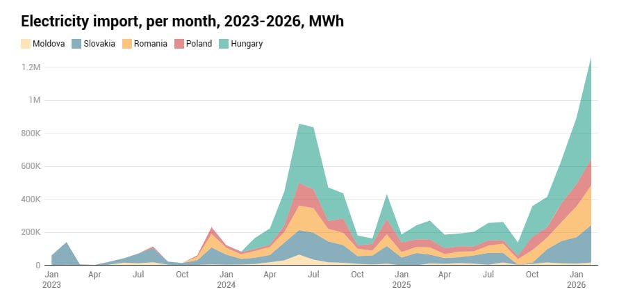 ️У лютому Україна імпортувала рекордні 1,26 млн МВт·год електроенергії — на 41% більше, ніж у січні