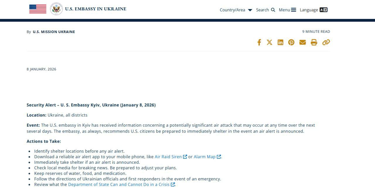️Посольство США в Україні попереджає про можливість серйозного удару росіян протягом найближчих днів