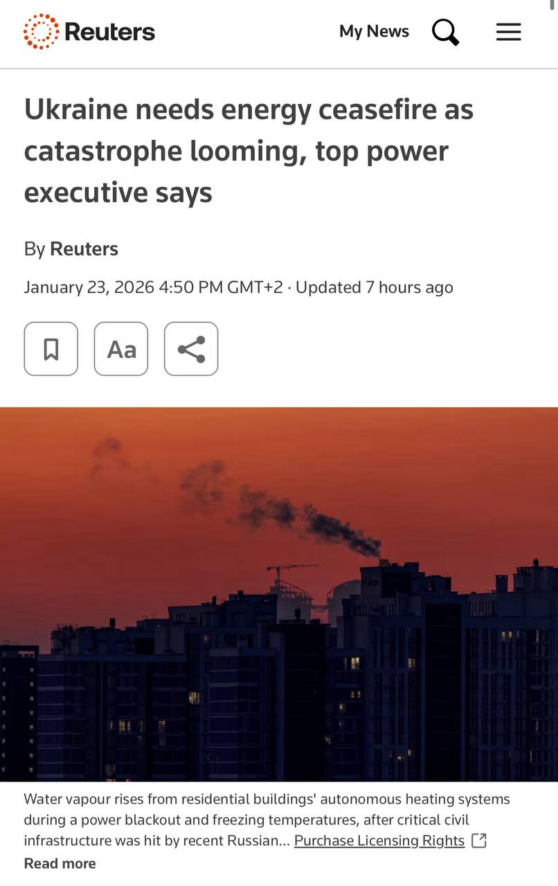 Як пише Reuters, цитуючи Максима Тімченка, більшість українців мають доступ до електроенергії лише на 3–4 години на добу, після чого слідують тривалі відключення, що можуть сягати 10–15 годин. А утримувати систему наразі вдається лише завдяки імпорту газу, зокрема зі Сполучених Штатів.