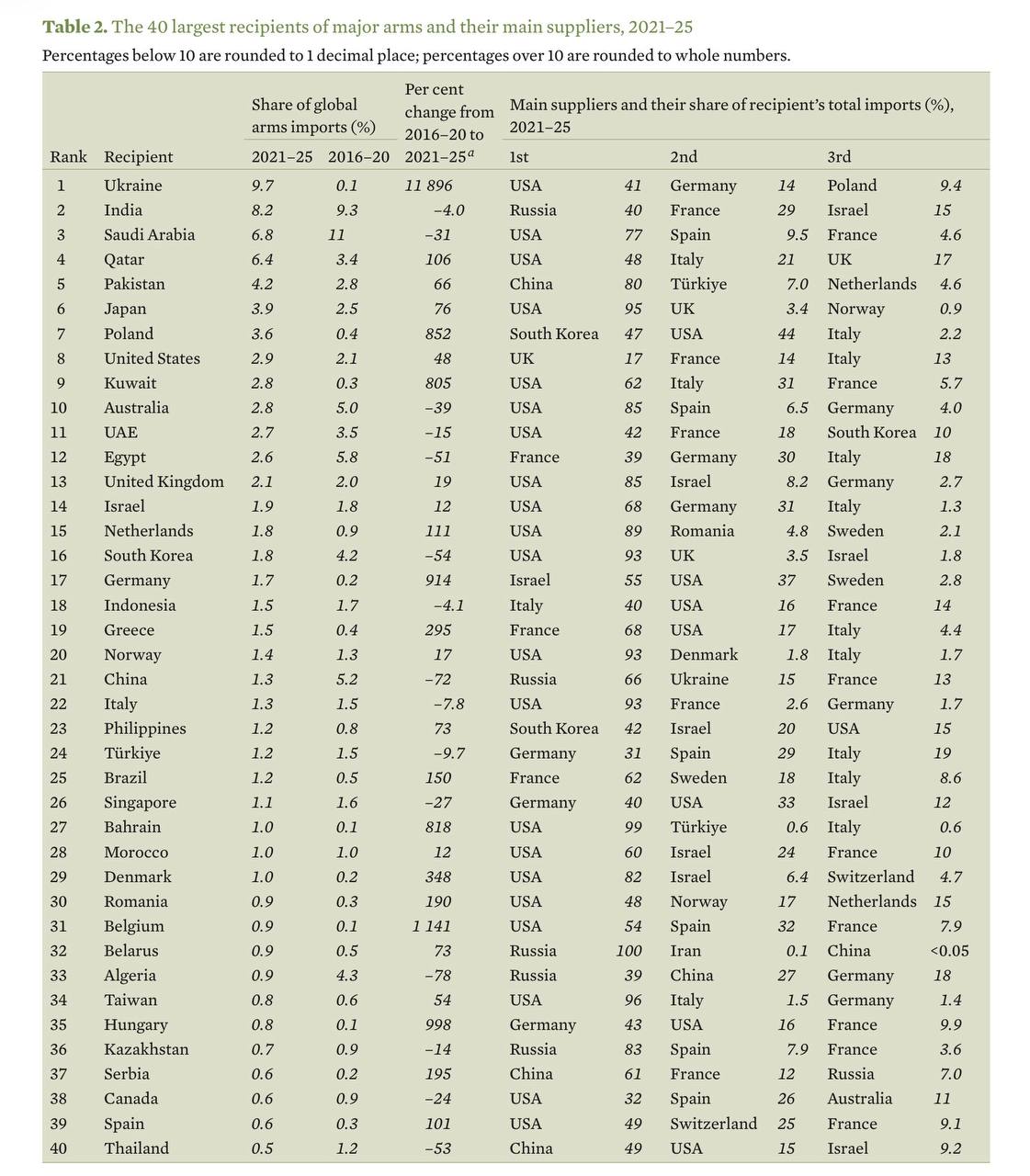 У 2021–2025 роках частка України в імпорті зброї склала 9,7%. А найбільшими постачальниками зброї Україні є США, Німеччина та Польща.
