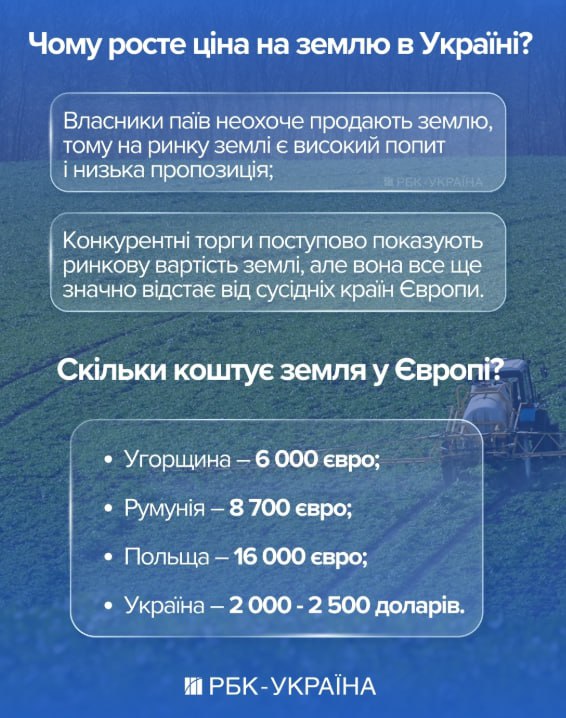 У Польщі ціна перевищує €16 000 за гектар, у Румунії становить близько €8 700, а в Угорщині — близько €6 000. Ці показники демонструють різницю вартості землі між Україною та країнами ЄС.