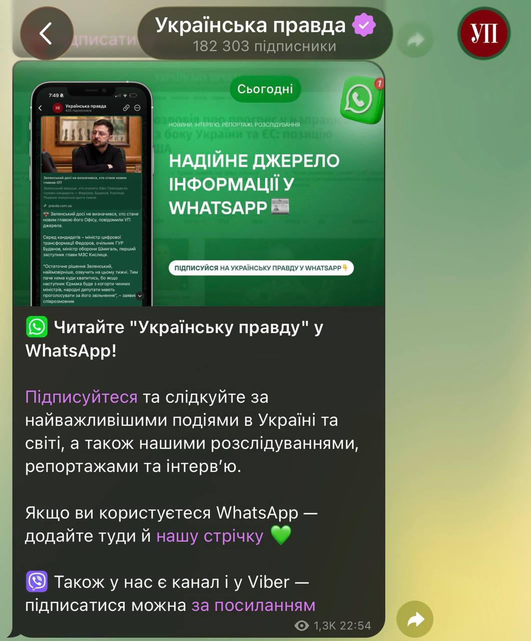 Тим часом «УП» явно занепокоєні можливим обмеженням Telegram в Україні, тож почали активно закликати підписників до WhatsApp і Viber