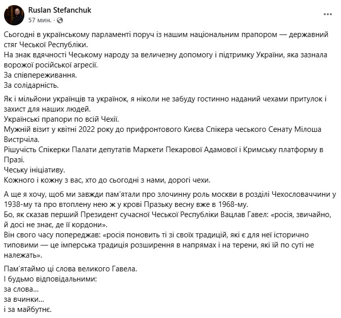 Спікер Руслан Стефанчук відповів своєму чеському колезі, який прибрав український прапор з будівлі парламенту Він вчинив навпаки і встановив прапор Чехії в Раді поруч із українським. Стефанчук згадав про підтримку чехів, зробивши реверанс в сторону минулої проукраїнської влади. Ну і зайвий раз похизувався своїм схудненням.
