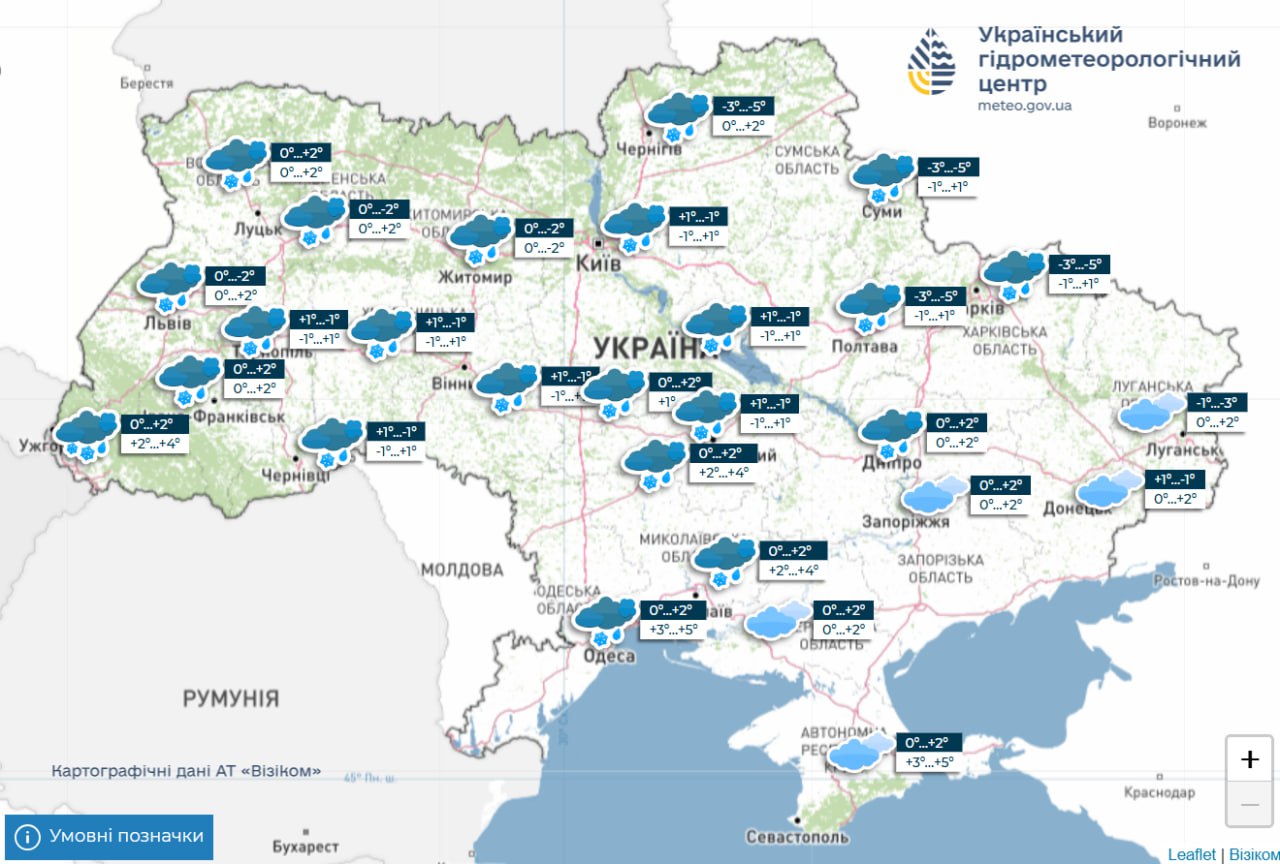 Погода в Україні сьогодні: мокрий сніг удень і морозні ночі