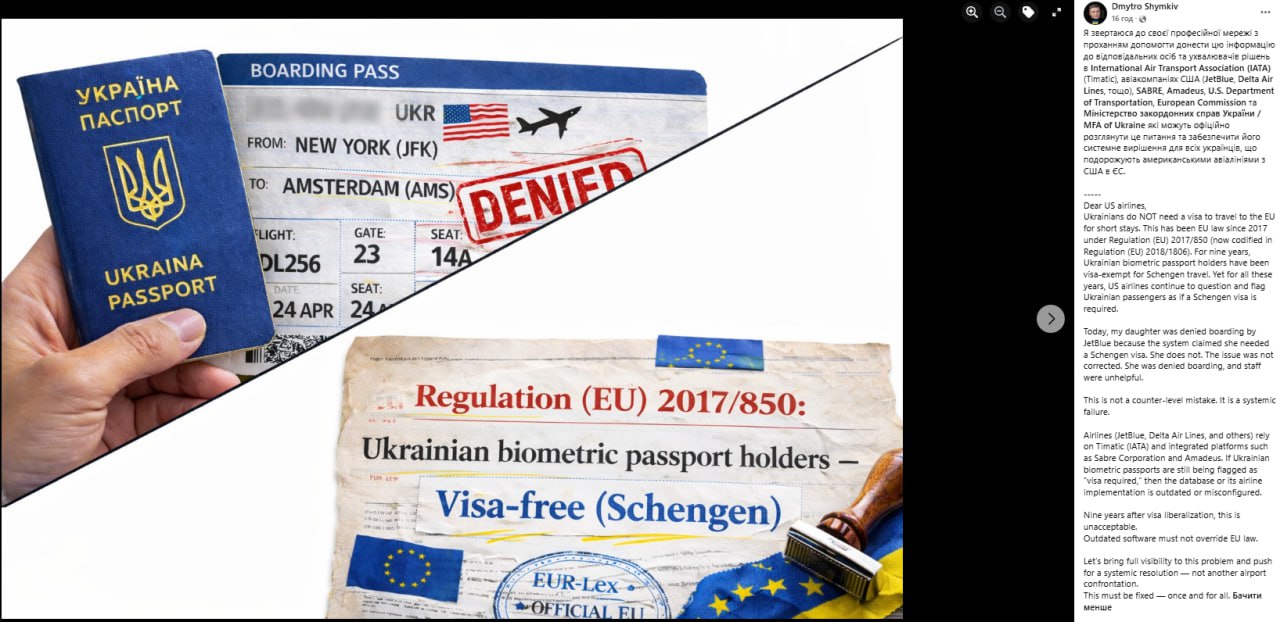 Проте протягом усіх цих років авіакомпанії США продовжують розпитувати та позначати українських пасажирів так, ніби їм потрібна шенгенська віза. Через дев’ять років після лібералізації візового режиму це неприйнятно. Застаріле програмне забезпечення не повинно мати перевагу над законодавством ЄС.