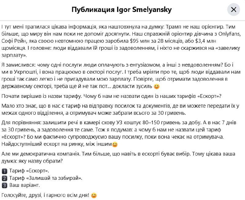 Голова “Укрпошти” Ігор Смілянський надихнувся онліфанщицею і пропонує назвати один з тарифів пошти “Ескорт”