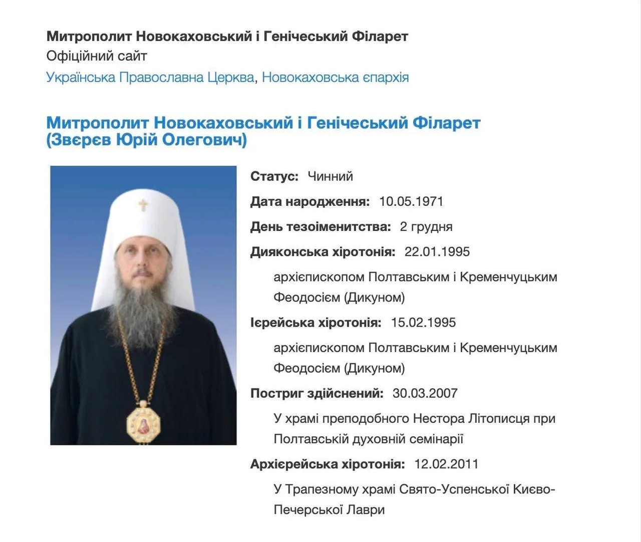 ️Проросійська УПЦ на своєму офіційному сайті стверджує, що колаборант Юрій Звєрєв, який на лівобережній Херсонщині підтримував російських окупантів, досі є чинним митрополитом Новокаховським і Генічеським УПЦ Філаретом. З серпня 2024 року Звєрєв є “єпархіальним архієреєм” окупаційної Новокаховської єпархії Російської православної церкви (Московського патріархату). Очолювана Філаретом єпархія почала співпрацювати з росіянами ще у 2022 році – 2 травня в її церквах поминали проросійських бойовиків, що загинули в Одесі 2 травня 2014 року, повідомляє “Мост”.