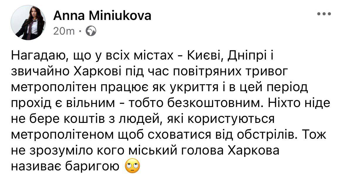 У Кличка образилися на випад мера Харкова про те, що «тільки барига може брати гроші за укриття», але вирішили публічно, прямо не атакувати, лише показали незадоволення ротом своєї ню-блогерки Анни Мінюкової, яка запевнила, мовляв «ніхто не бере коштів з людей, які користуються метрополітеном щоб сховатися від обстрілів».