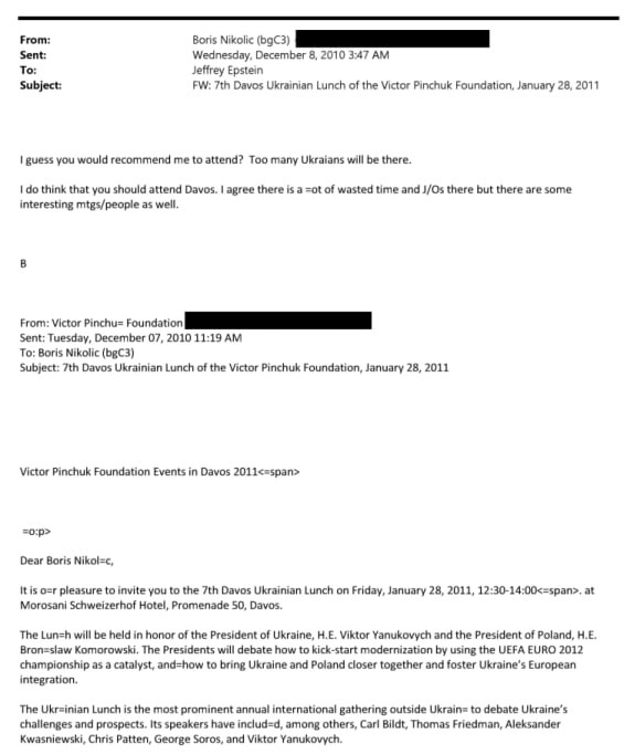 У 2010 та 2014 роках обговорювався форум в Давосі. Один із найближчих друзів Епштейна Борис Ніколіч – лікар, венчурний інвестор і головний радник з науки та технологій у Білла Гейтса – розповів про запрошення на захід Віктора Пінчука. Показово, що у січні 2014 році Білл Гейтс, який, як відомо, підхопив венеричну хворобу під час візиту до Епштейна, поїхав у Давос.