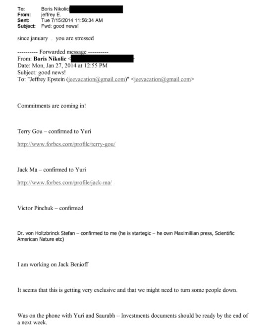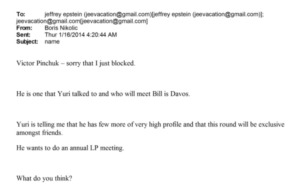 У переписці фігурує дехто Yuri, який виступає радником у питаннях по Україні. Йдеться про російсько-ізраїльського мільярдера Юрія Мільнера, співзасновника та ексголову ради директорів інтернет-компанії Mail.Ru Group, а також співінвестора ICO месенджера Telegram.