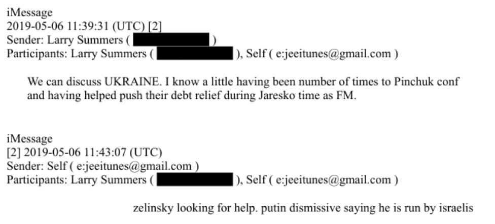 У 2019 році, за кілька місяців до смерті Епштейна йому писав ексміністр фінансів Лоуренс Саммерс. Він згадував форум Пінчука, а також говорив про те, що «Зеленський шукає допомоги, а Путін зневажливо каже, що ним керують ізраїльтяни».