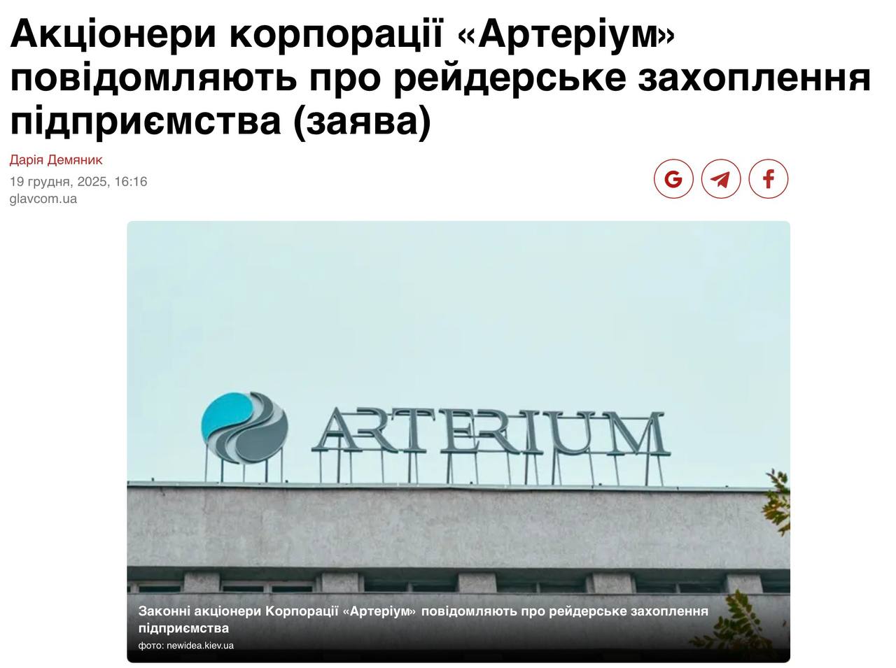На підставі підроблених шахраями іноземних документів… було здійснено на території України заміну найбільшого бенефіціарного власника, який не змінювався протягом останніх 15 років, а згодом – швидку та синхронну заміну керівників Корпорації «Артеріум» і ТОВ «Артеріум ЛТД» та заміну статутних документів. Такі дії є очевидними маркерами рейдерського захоплення підприємств.