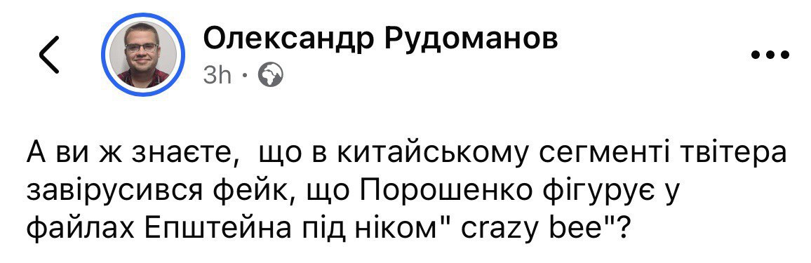 “А ви ж знаєте, що в китайському сегменті твітера завірусився фейк, що Порошенко фігурує у файлах Епштейна під ніком “crazy bee”?”, —