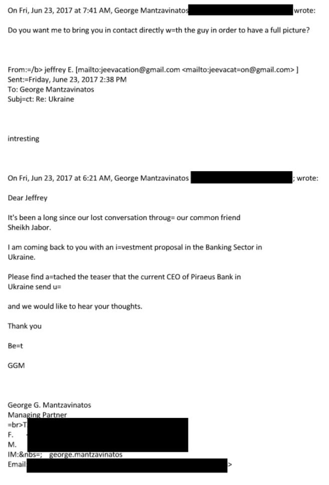 У листі від червня 2017 року грецький бізнесмен Георгіос Манцавінатос повідомив Епштейну про “можливості вкладень в банківський сектор України” та додав презентацію українського підрозділу Piraeus Bank. Епштейн відповів, що зацікавився, і звернувся до банкіра Девіда Стерна.