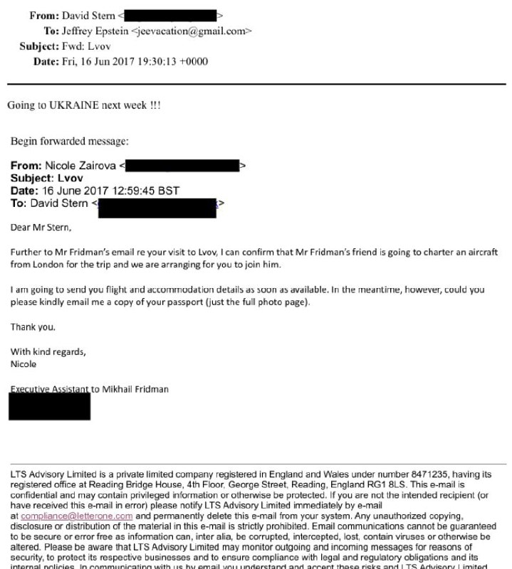 ️ У переписці від 25 червня 2017 року Стерн повідомляє: “я тут [в Україні] с Михаилом Фрідманом”. Стерн попередив Епштейна про поїздку до Львова з Фрідманом і переслав лист його помічниці Нігіни Заїрової (Ніколь), яка просила фото паспорта для перельоту приватним джетом.