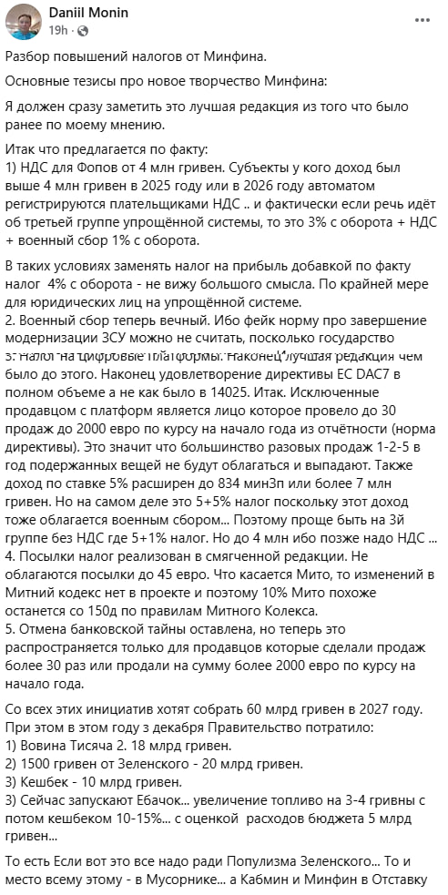 Данііл Монін проаналізувавши великий податковий законопроект від Мінфіну, зазначив, що від запровадження ПДВ для ФОПів, податку на цифрові платформи та скасування пільг на посилки держава планує отримати “60 млрд гривен в 2027 году”. Водночас, за його словами, лише за останні місяці уряд витратив “18 млрд гривен” на “Вовину тисячу 2”, “20 млрд гривен” на виплату ₴1500 та ще “10 млрд гривен” на кешбек.
