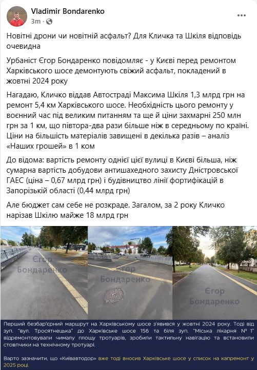 1,3 млрд грн на Харківське шосе: перед ремонтом демонтують асфальт, покладений у 2024 році — блогер Бондаренко