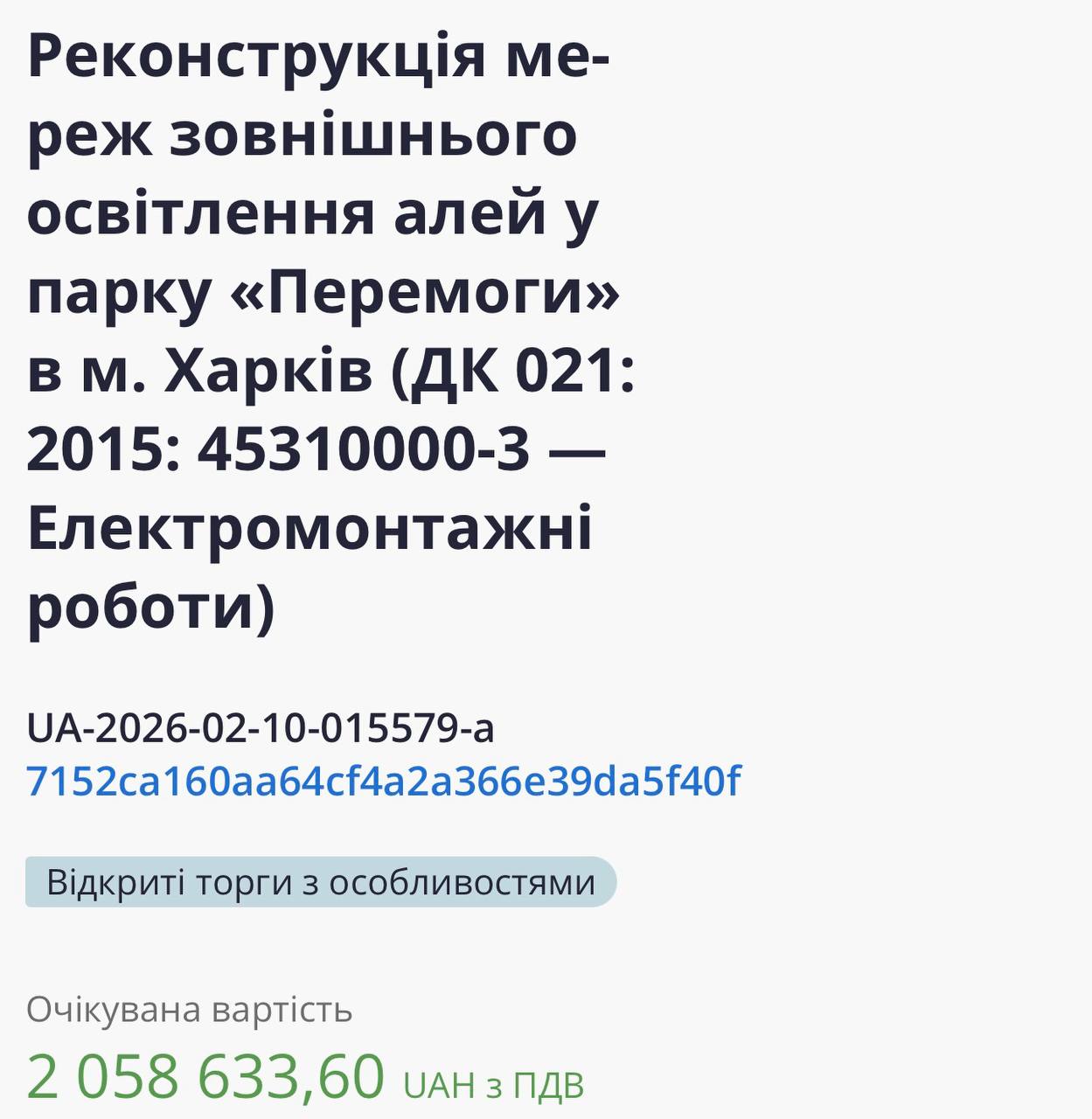 Департамент житлово-комунального господарства Харківської міської ради оголосило торги на 2,05 млн грн щодо реконструкції мереж зовнішнього освітлення алей у парку “Перемоги” на Салтівці.