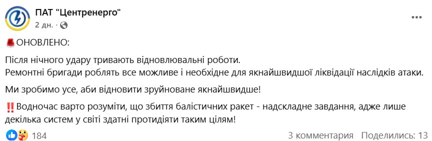 “Центренерго”: емоційний пост викликав реакцію ОП