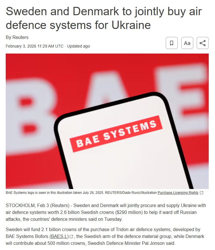 Міністри оборони Швеції та Данії 3 лютого повідомили про спільну закупівлю і постачання Україні систем протиповітряної оборони. Загальна вартість проєкту становить 2,6 млрд шведських крон.