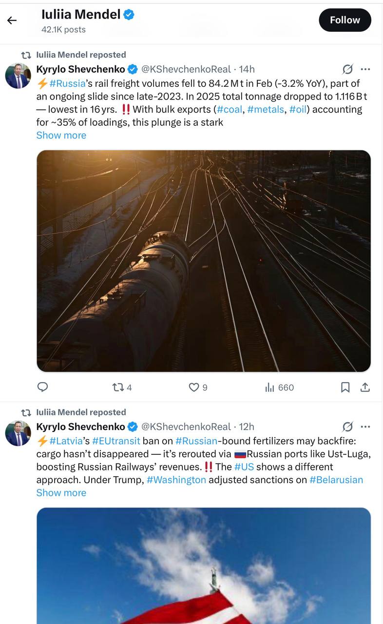 До речі, Мендель у себе в X активно репостить твіти колишнього очільника Нацбанку Кирила Шевченка, який у 2022 році пішов в відставку і втік до Відня за 2 дні до того як НАБУ оголосила йому підозру у розкраданні коштів «Укргазбанку», який той раніше очолював