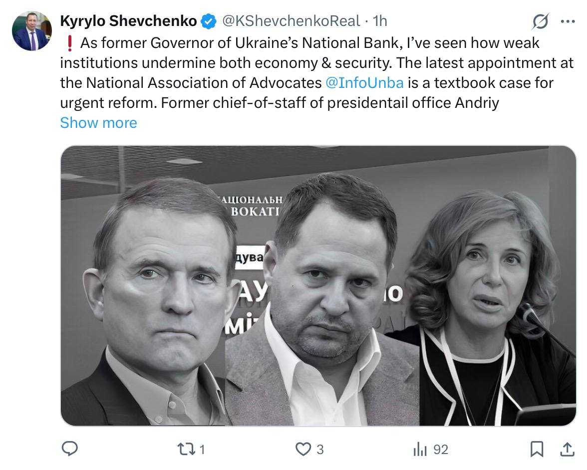 Сам Шевченко пояснював свою відставку тиском зі сторони ОП, зокрема, Єрмака. Зараз в Х він переважно активно постить різні економічні новини, і за нагоди шпиняє Єрмака.
