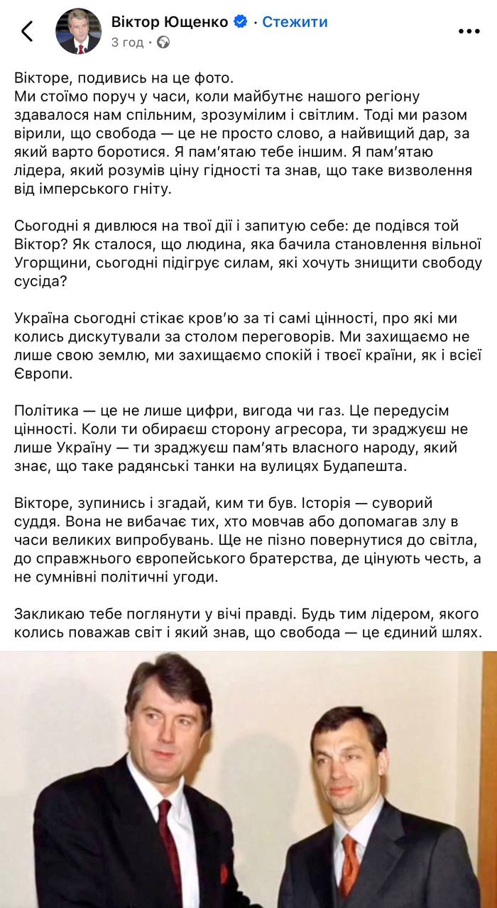 Експрезидент України Віктор Ющенко написав відкритого листа до премʼєра Угорщини Віктора Орбана і закликав переглянути його позицію щодо України: