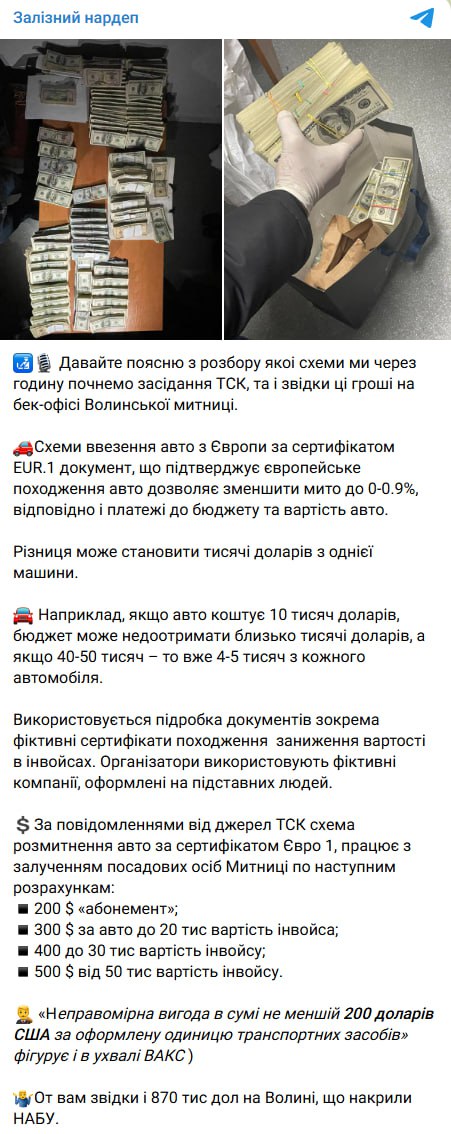 Железняк повідомив, що за даними джерел ТСК схема працювала із залученням посадових осіб митниці. За його словами, “200 $ — абонемент; 300 $ за авто до 20 тис вартості інвойса; 400 до 30 тис; 500 $ від 50 тис”. Він додав: “Неправомірна вигода в сумі не меншій 200 доларів США за оформлену одиницю транспортних засобів фігурує і в ухвалі ВАКС”.