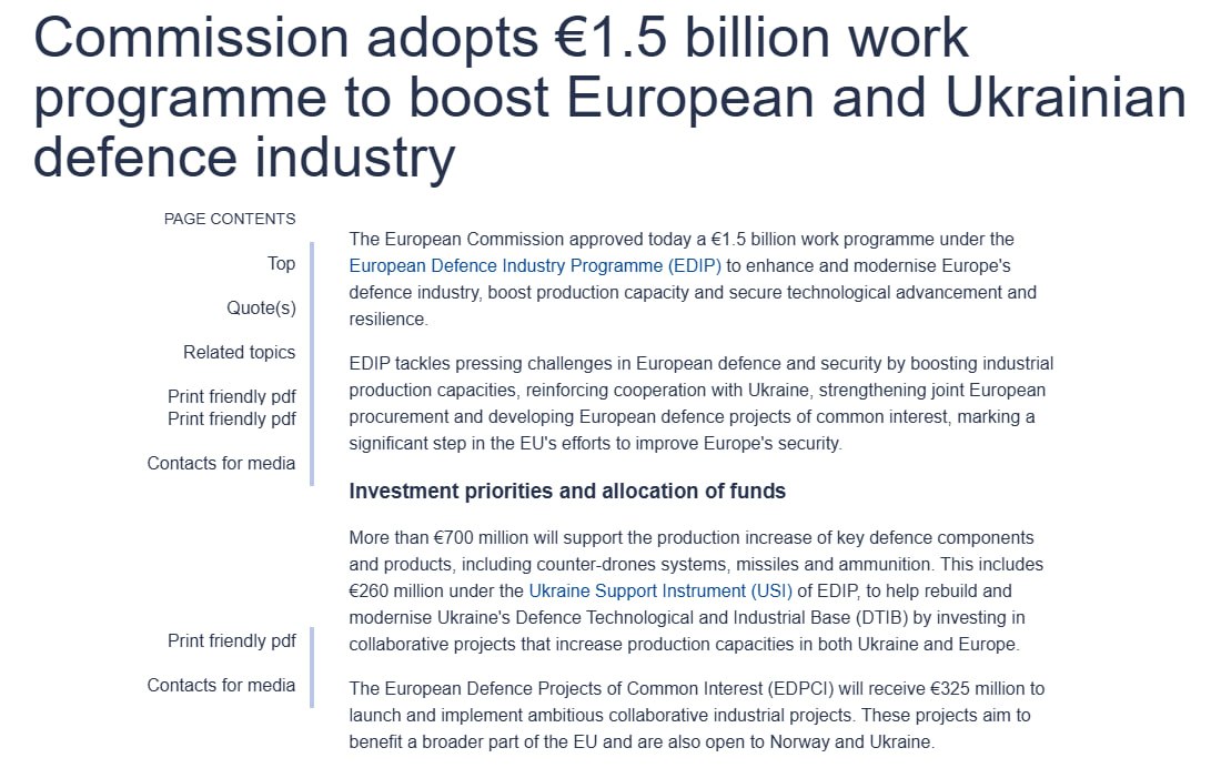 Європейська комісія сьогодні затвердила програму European Defence Industry Programme (EDIP) обсягом €1,5 млрд для посилення оборонної промисловості ЄС і співпраці з Україною.