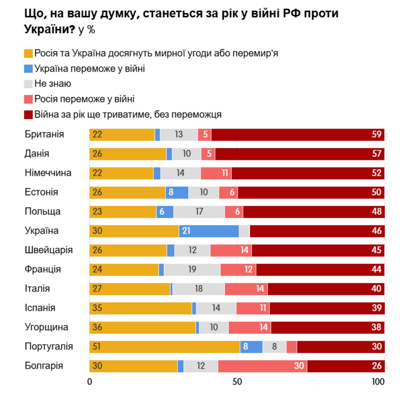 У підписання мирної угоди у 2026 році найбільше вірять в Іспанії та Португалії. Водночас останні разом з Естонією найбільш оптимістичні щодо завершення війни перемогою України (хоча навіть там в це вірять менше 10% опитаних).