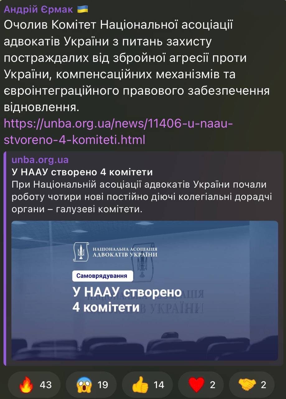 До речі, на честь призначення, Андрій Єрмак вперше після звільнення з ОП вийшов в паблік, аби повідомити, що очолив Комітет Національної асоціації адвокатів України.