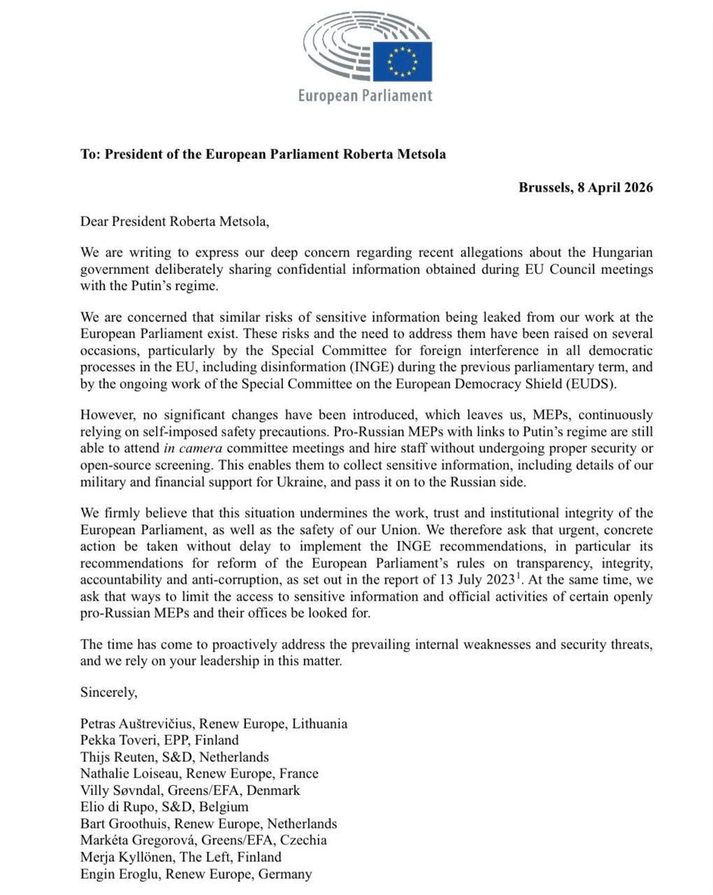 Крім того, група євродепутатів надіслала президентці Європейського парламенту Роберті Мецолі лист, в якому висловили стурбованість ризиками витоку інформації на тлі інциденту з Угорщиною та Росією.