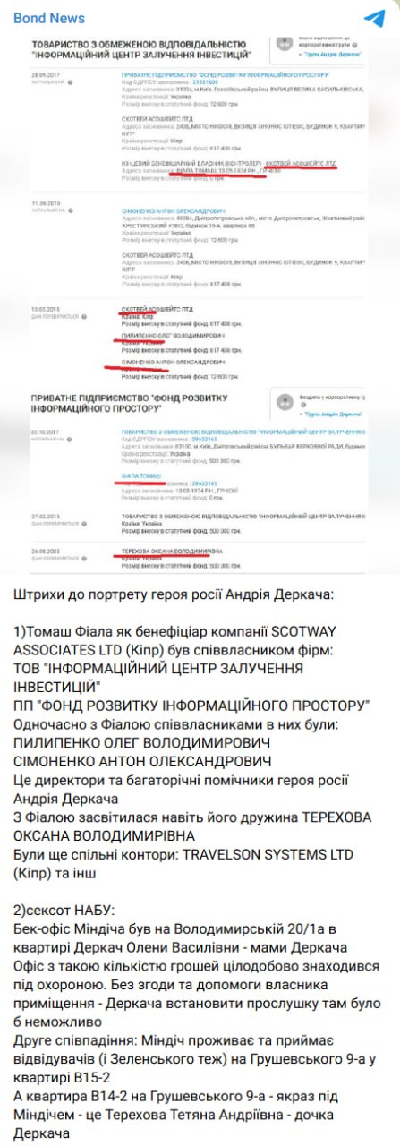Блогер Володимир Бондаренко повідомив, що бенефіціар компанії SCOTWAY ASSOCIATES LTD (Кіпр) Томаш Фіала був співвласником ТОВ “Інформаційний центр залучення інвестицій” та ПП “Фонд розвитку інформаційного простору”.