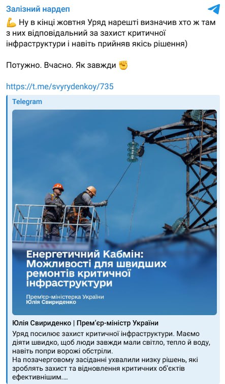 ️Уряд у жовтні “раптом згадав”, що критичну інфраструктуру треба захищати: Кабмін створює Координаційний центр на чолі з Кулебою — Железняк “Ну в кінці жовтня Уряд нарешті визначив хто ж там з них відповідальний за захист критичної інфраструктури і навіть прийняв якісь рішення. Потужно. Вчасно. Як завжди”, – іронічно зазначив народний депутат Ярослав Железняк, коментуючи свіжий допис, який у себе в Телеграм розмістила Юлія Свириденко. До посту він додав лінк на повідомлення прем’єрки Юлії Свириденко,яка повідомила, що уряд створює Координаційний центр інженерного захисту під керівництвом Олексія Кулеби, оновлює перелік пріоритетних видатків для швидшого фінансування ремонтів енергетики, скорочує бюрократію в будівництві захисних споруд та спрямує додаткові кошти з резервного фонду на укріплення енергетичних і транспортних систем у прифронтових регіонах та для Укрзалізниці.