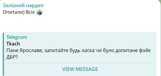 Журналіст УП Михайло Ткач написав у своєму Telegram: “Пане Ярославе, запитайте будь ласка чи було допитане або опитане фойє ДБР?”. Ярослав Железняк відповів у Telegram: “Опитали) Всіх ️”. Далі він додав: “Нове модне місце в Києві – фойє ДБР. Кажуть, там в приймальні громадян навіть екс-помічника Деркача Миронюка опитували”.